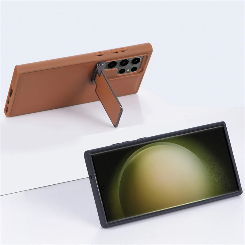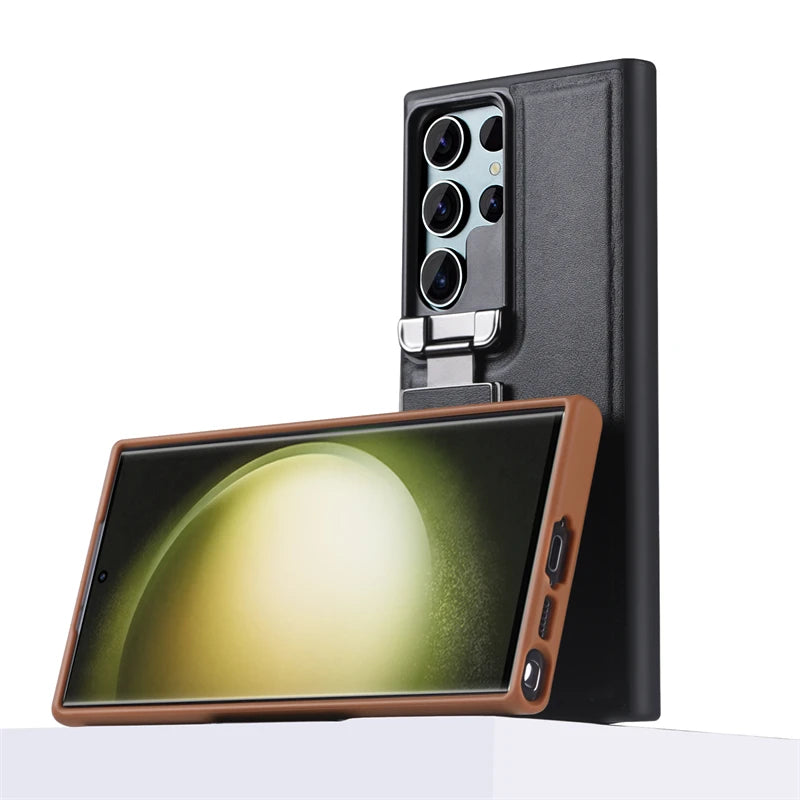 Premium leather case designed for Samsung Galaxy Phones. Available in classic Black and rich Brown colors. Compatible with multiple models including Samsung S23, S22, S24, and their variants.