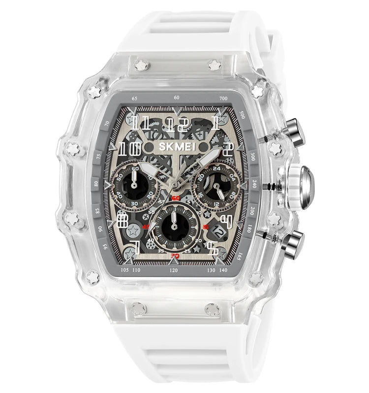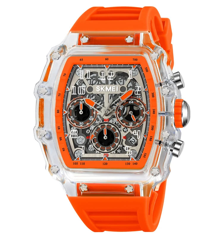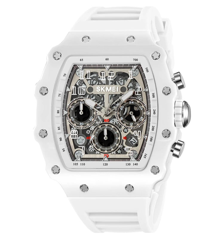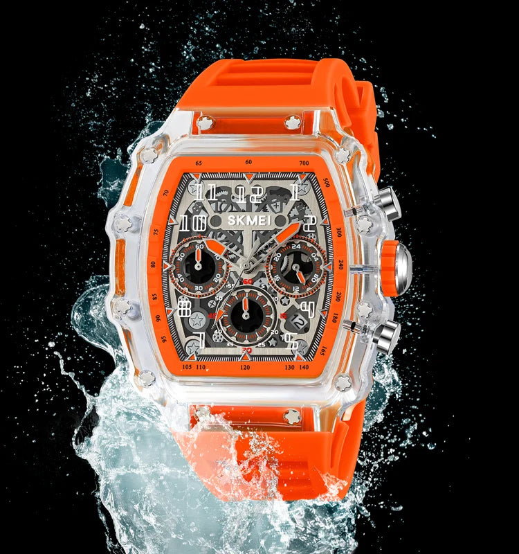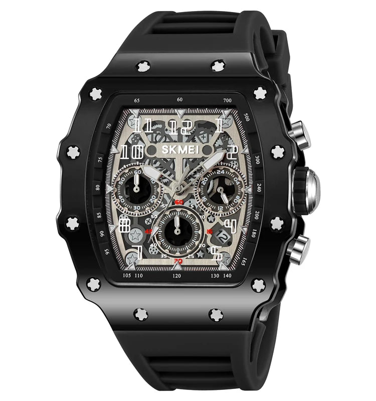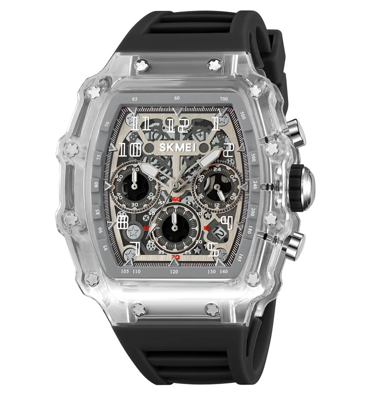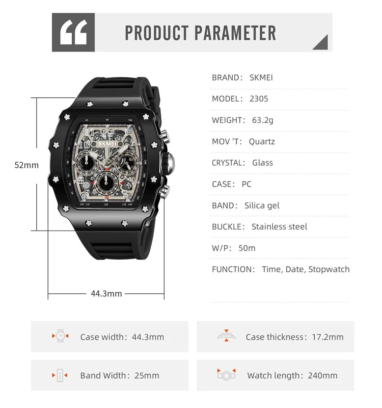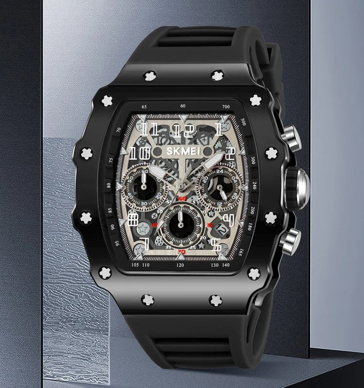 The watch is made with a stainless steel case and a high-quality silicone strap for durability and comfort.