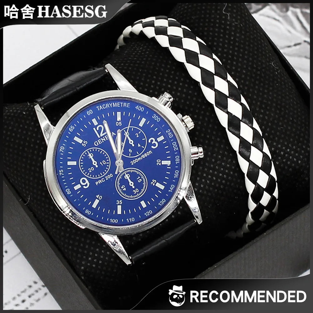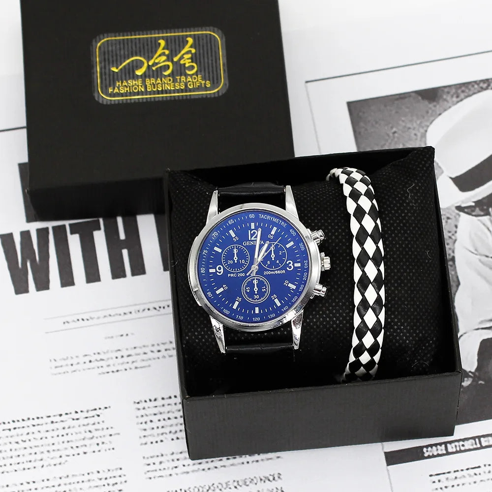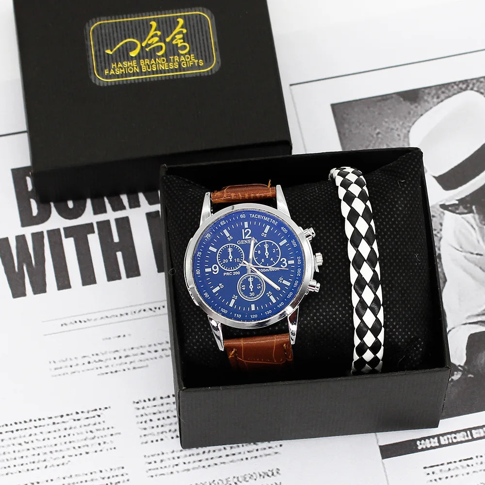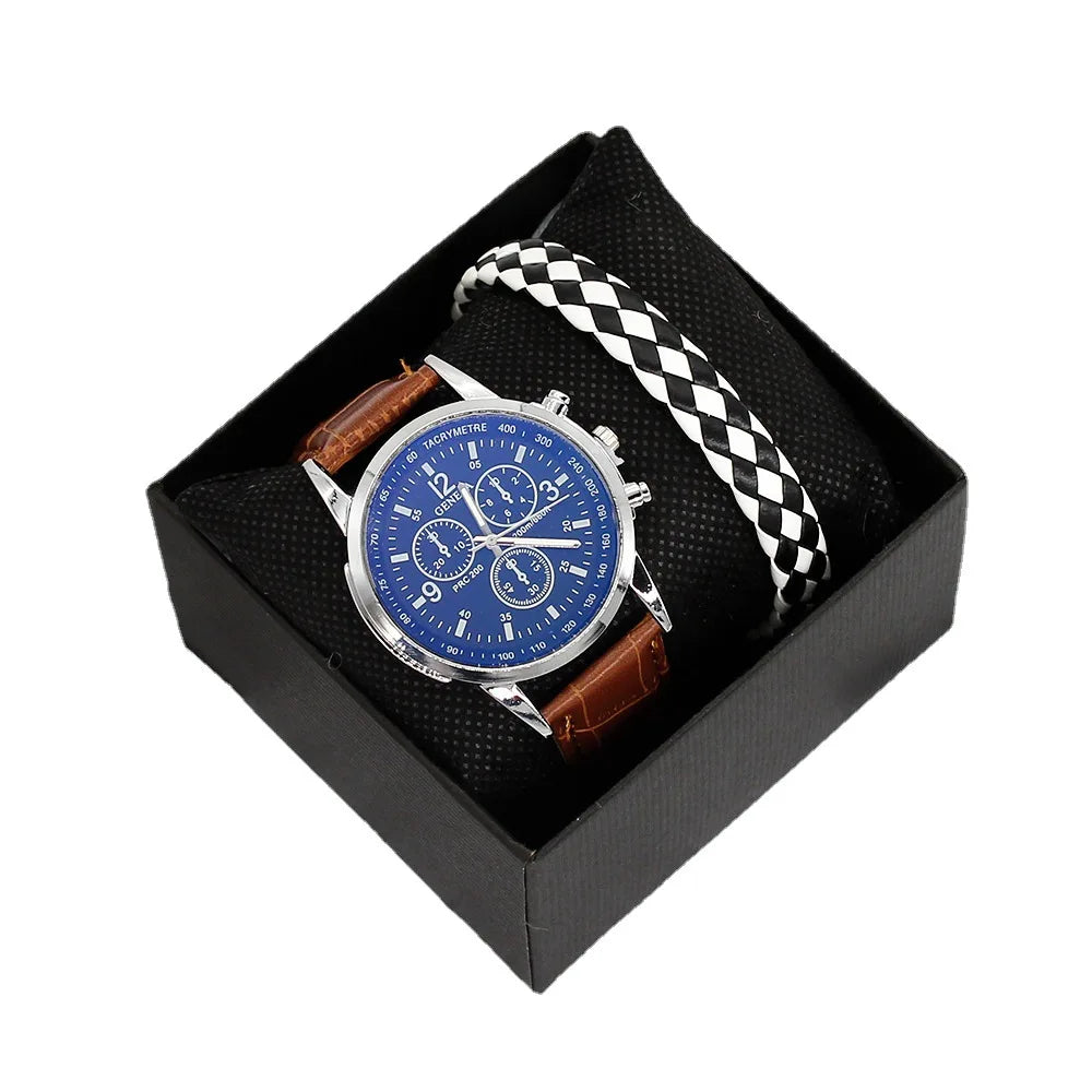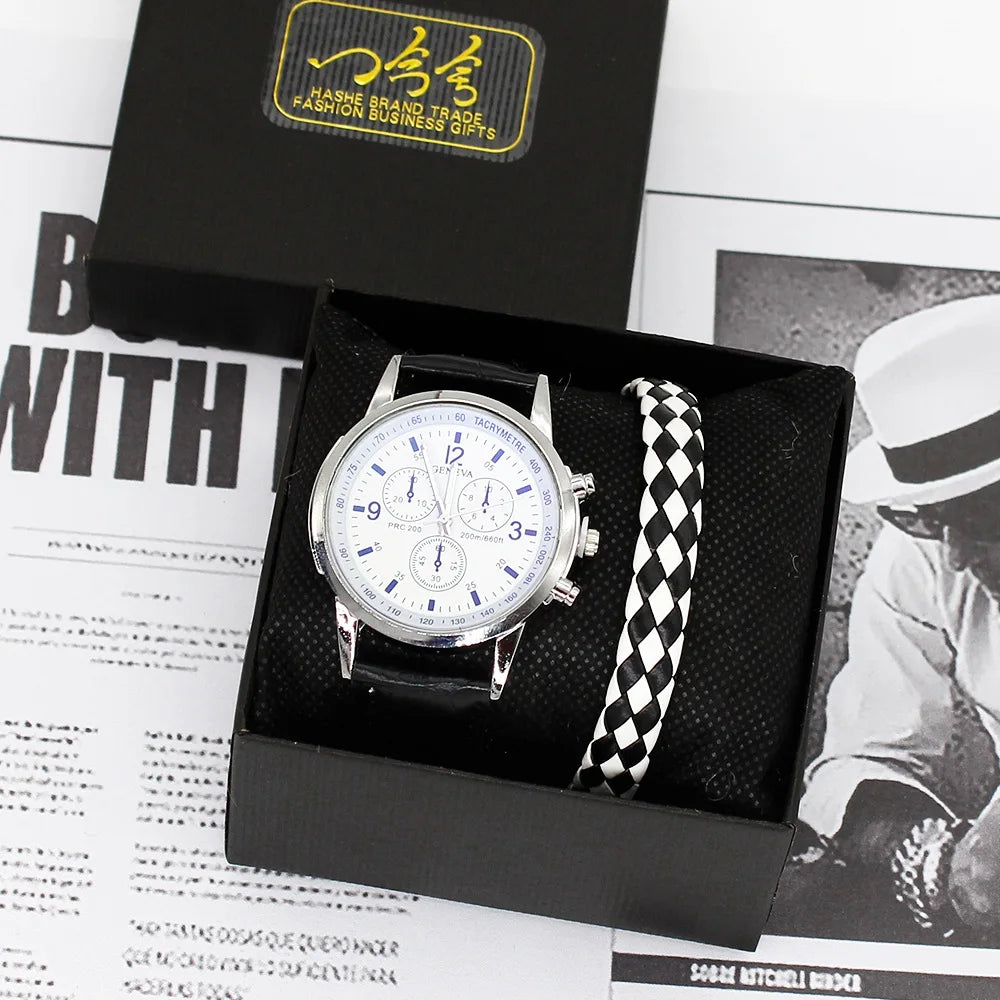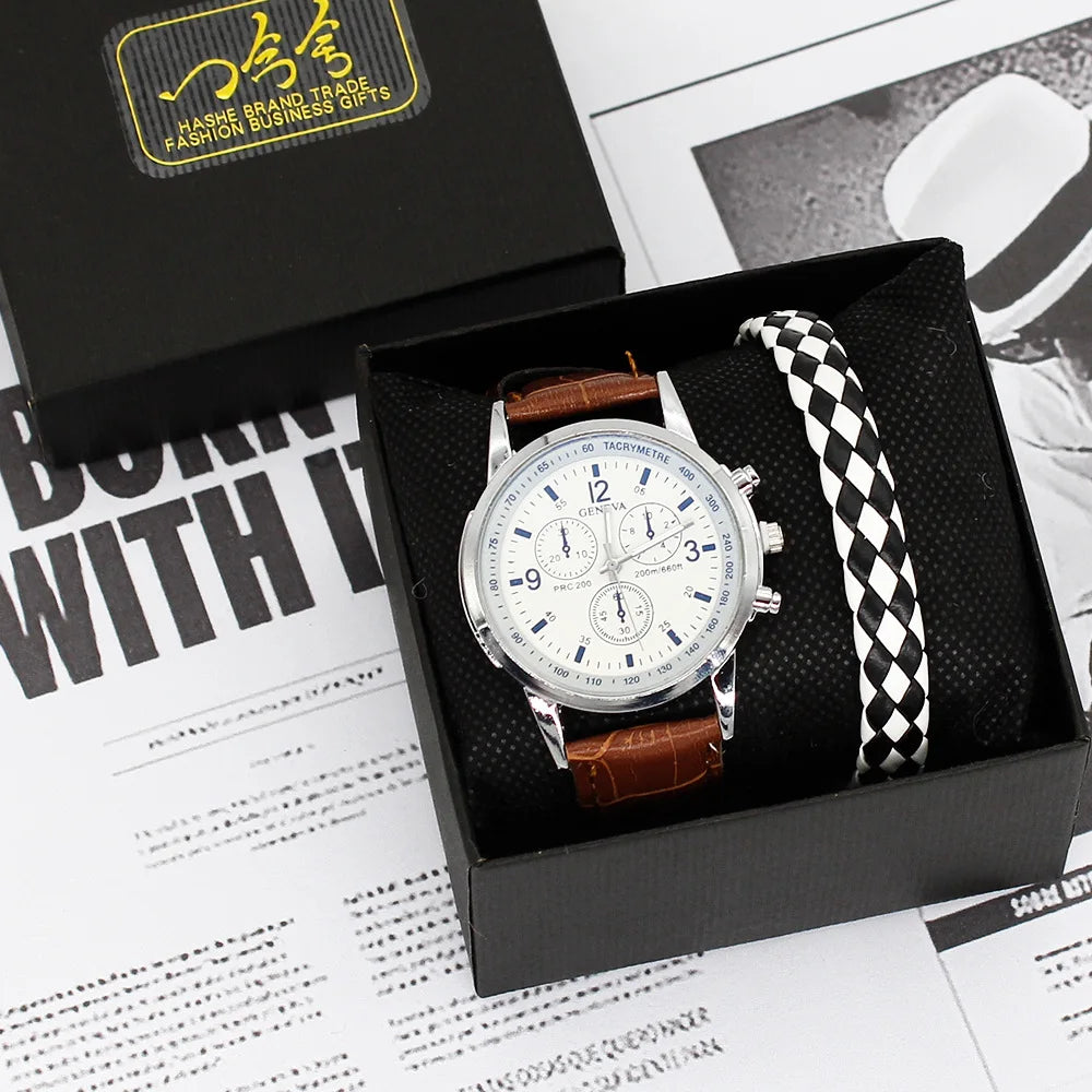 Men’s Quartz Watch & Bracelet Gift Set with Leather Strap