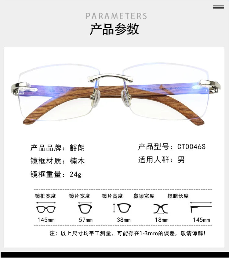 Men’s Titanium Rimless Glasses with Wood Temples Specification