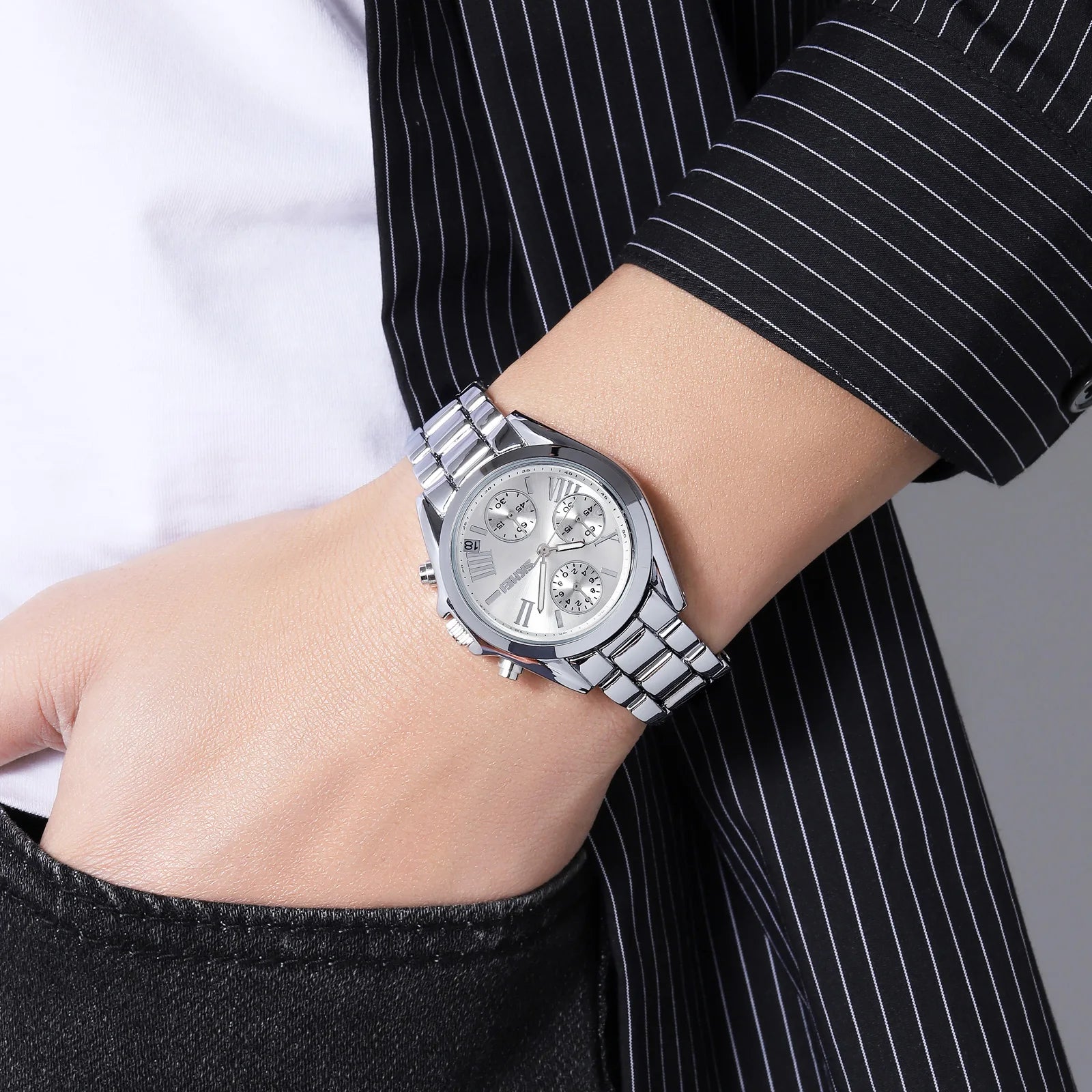 This watch is crafted from high-quality stainless steel, providing durability and a sleek appearance.