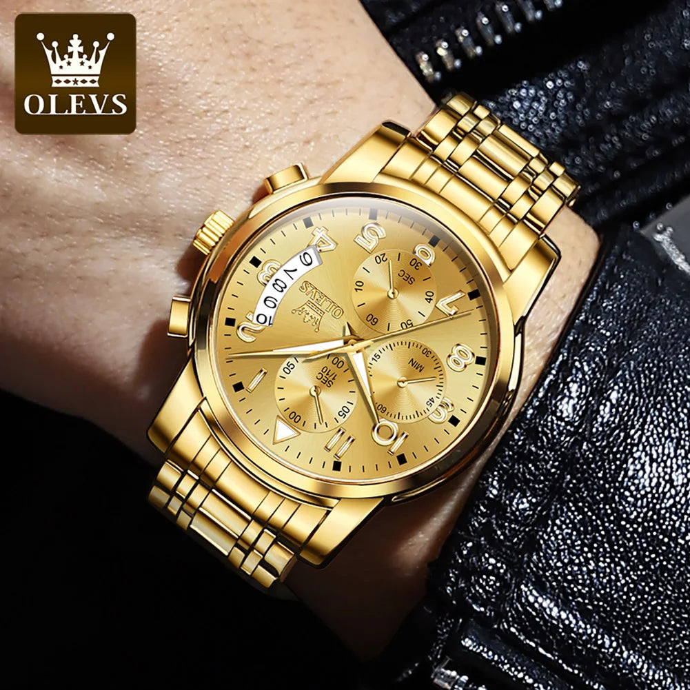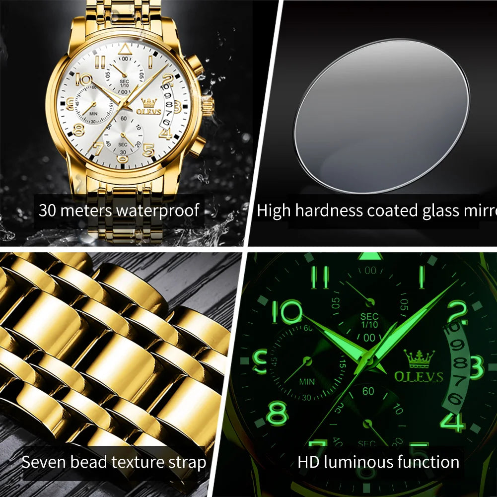 The OLEVS Men’s Quartz Watch is available in Black, White, and Gold colors.