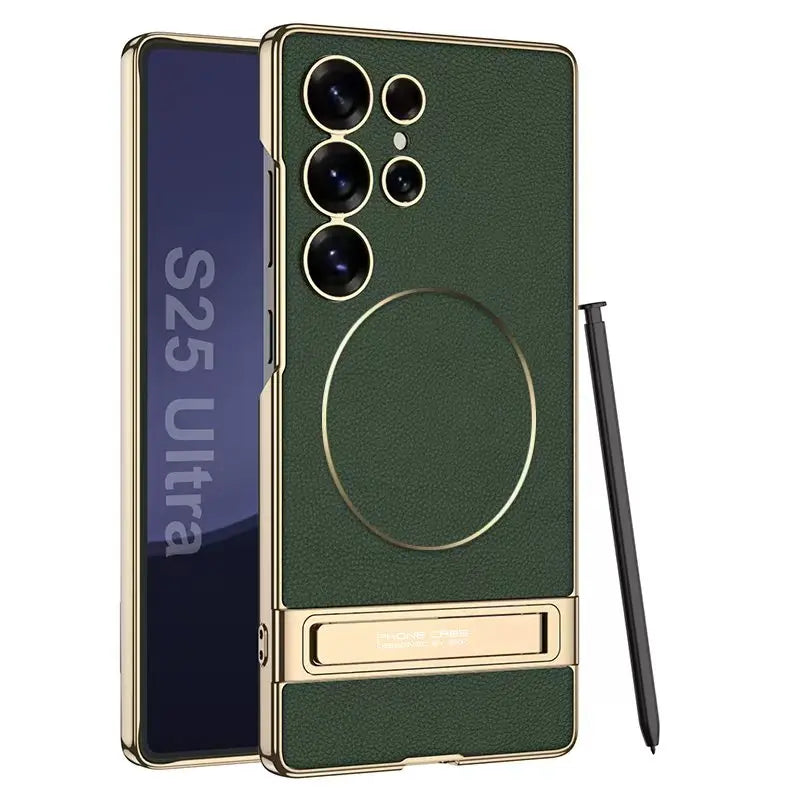 The Protective Leather Case is compatible with Samsung S24 Ultra, S25 Ultra, and S23 Ultra models.