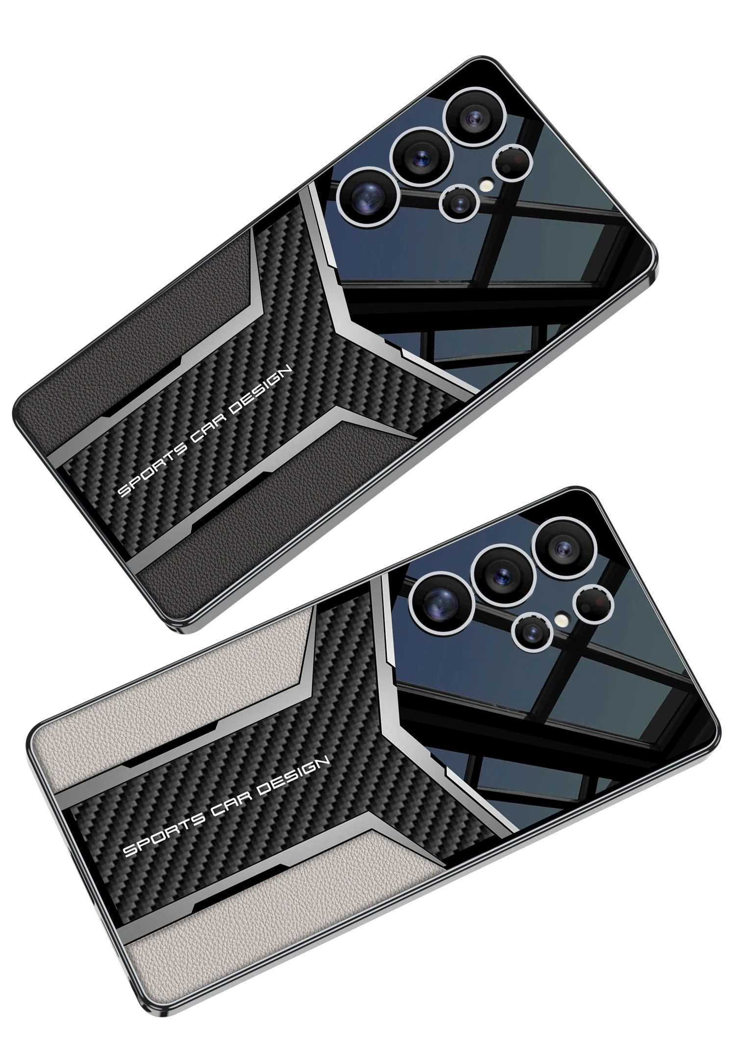 The case features a luxurious leather finish combined with a stylish carbon fiber design.