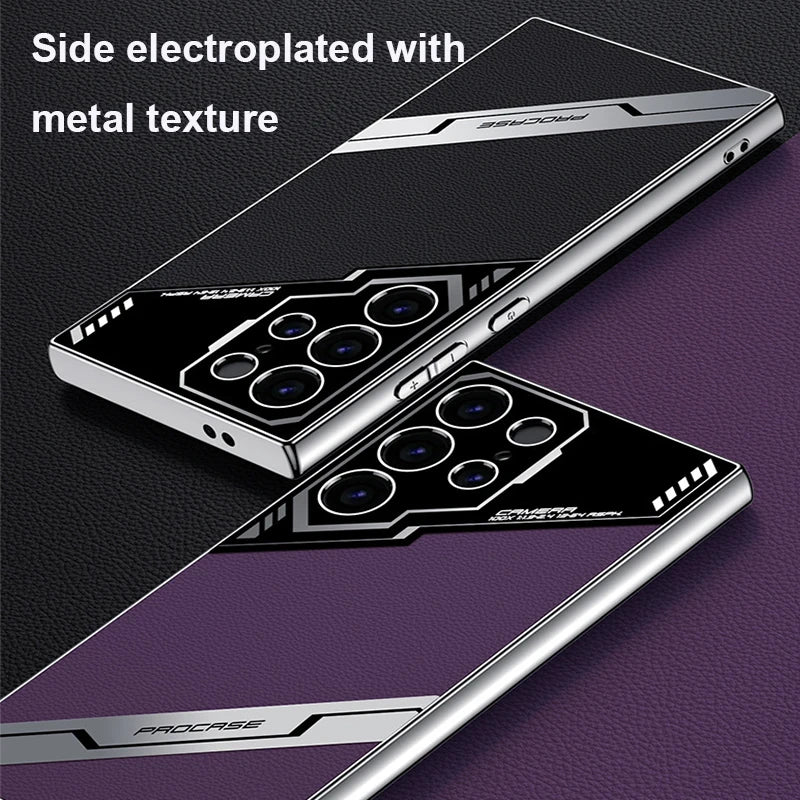 Enhance your Samsung Galaxy experience with our premium Leather Case featuring an electroplated finish. Available in stylish colors like Purple, Gray, Black, and Green, this case offers both elegance and durability.