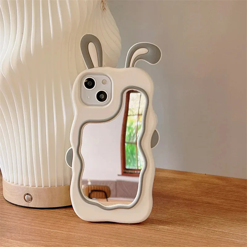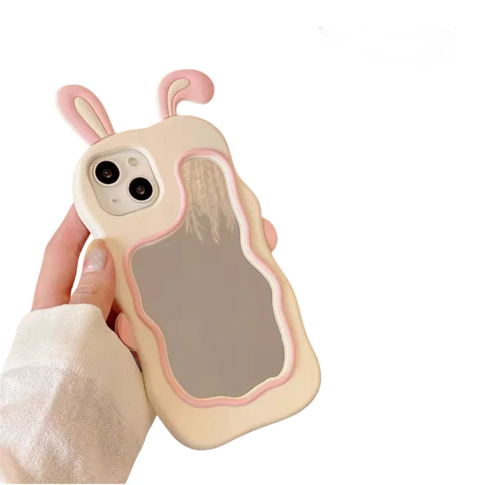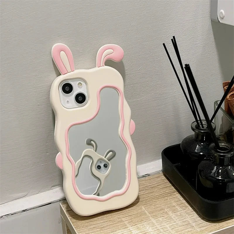 Protect your iPhone in style with the Wave Border Silicone Mirror Case, designed for various models including iPhone 14, 13, and 15. Its unique pink ears design adds a playful touch while offering durable silicone protection against drops and scratches.